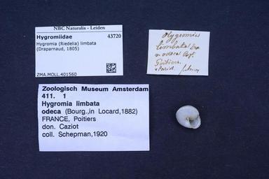 | Keywords: Naturalis Biodiversity Center - ZMA.MOLL.401560 - Hygromia (Riedelia) limbata (Draparnaud, 1805) - Hygromiidae - Mollusc shell.jpeg artwork Dimensions artwork Document type Hygromiidae subfamily Hygromiinae Hygromia Individual count Infraspecific epithet Infraspecific rank Institution Naturalis Kind of unit artwork Kind of unit specimen shell Life stage Medium artwork Nomenclatural code Source institute Rijksmuseum van Natuurlijke Historie Leiden Scale the width of the text on the species/QR-code label is 38 mm Occurrence ID page Other fields Other versions artwork Permission license Naturalis donation CC-0 Mollusca Publication location Scientific name Hygromia Riedelia limbata Draparnaud 1805 Scientific name authorship Draparnaud 1805 Source url http //bioportal naturalis nl Specific epithet limbata State or province Subject keywords artwork Subject keywords publication Title artwork Title publication Type status Uploaded with GWToolset Naturalis_Biodiversity_Center_-_ZMA MOLL 401560_-_Hygromia_ Riedelia _limbata_ Draparnaud _1805 _-_Hygromiidae_-_Mollusc_shell http //medialib naturalis nl/file/id/ZMA MOLL 401560/format/large Molluscs at Naturalis from the Zoölogisch Museum Amsterdam Media donated by Naturalis Biodiversity Center Hygromia limbata Hygromia |