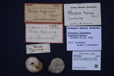 | Keywords: Naturalis Biodiversity Center - ZMA.MOLL.407021 - Chilostoma (Cingulifera) cingulatum tigrinum (De Cristofori & Jan, 1832) - Helicidae - Mollusc shell.jpeg artwork Dimensions artwork Document type Helicidae subfamily Helicigoninae Chilostoma Individual count Infraspecific epithet tigrinum Infraspecific rank Institution Naturalis Kind of unit artwork Kind of unit specimen shell Life stage Medium artwork Nomenclatural code Source institute Zoölogisch Museum Amsterdam Scale the width of the text on the species/QR-code label is 38 mm Occurrence ID page Other fields Other versions artwork Permission license Naturalis donation CC-0 Mollusca Publication location Scientific name Chilostoma Cingulifera cingulatum tigrinum De Cristofori Jan 1832 Scientific name authorship De Cristofori Jan 1832 Source url http //bioportal naturalis nl Specific epithet cingulatum State or province Subject keywords artwork Subject keywords publication Title artwork Title publication Type status Uploaded with GWToolset Naturalis_Biodiversity_Center_-_ZMA MOLL 407021_-_Chilostoma_ Cingulifera _cingulatum_tigrinum_ De_Cristofori_ _Jan _1832 _-_Helicidae_-_Mollusc_shell http //medialib naturalis nl/file/id/ZMA MOLL 407021/format/large Molluscs at Naturalis from the Zoölogisch Museum Amsterdam Media donated by Naturalis Biodiversity Center Chilostoma cingulatum Chilostoma |