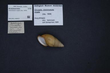 | Keywords: Naturalis Biodiversity Center - ZMA.MOLL.408423 - Dolichostyla virgata (Jay, 1839) - Bradybaenidae - Mollusc shell.jpeg artwork Dimensions artwork Document type Bradybaenidae Dolichostyla Individual count Infraspecific epithet Infraspecific rank Institution Naturalis Kind of unit artwork Kind of unit specimen shell Life stage Medium artwork Nomenclatural code Source institute Zoölogisch Museum Amsterdam Scale the width of the text on the species/QR-code label is 38 mm Occurrence ID page Other fields Other versions artwork Permission license Naturalis donation CC-0 Mollusca Publication location Scientific name Dolichostyla virgata Jay 1839 Scientific name authorship Jay 1839 Source url http //bioportal naturalis nl Specific epithet virgata State or province Subject keywords artwork Subject keywords publication Title artwork Title publication Type status Uploaded with GWToolset Naturalis_Biodiversity_Center_-_ZMA MOLL 408423_-_Dolichostyla_virgata_ Jay _1839 _-_Bradybaenidae_-_Mollusc_shell http //medialib naturalis nl/file/id/ZMA MOLL 408423/format/large Molluscs at Naturalis from the Zoölogisch Museum Amsterdam Media donated by Naturalis Biodiversity Center Dolichostyla virgata Dolichostyla |