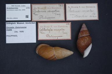 | Keywords: Naturalis Biodiversity Center - ZMA.MOLL.408426 - Dolichostyla virgata (Jay, 1839) - Bradybaenidae - Mollusc shell.jpeg artwork Dimensions artwork Document type Bradybaenidae Dolichostyla Individual count Infraspecific epithet Infraspecific rank Institution Naturalis Kind of unit artwork Kind of unit specimen shell Life stage Medium artwork Nomenclatural code Source institute Zoölogisch Museum Amsterdam Scale the width of the text on the species/QR-code label is 38 mm Occurrence ID page Other fields Other versions artwork Permission license Naturalis donation CC-0 Mollusca Publication location Scientific name Dolichostyla virgata Jay 1839 Scientific name authorship Jay 1839 Source url http //bioportal naturalis nl Specific epithet virgata State or province Subject keywords artwork Subject keywords publication Title artwork Title publication Type status Uploaded with GWToolset Naturalis_Biodiversity_Center_-_ZMA MOLL 408426_-_Dolichostyla_virgata_ Jay _1839 _-_Bradybaenidae_-_Mollusc_shell http //medialib naturalis nl/file/id/ZMA MOLL 408426/format/large Molluscs at Naturalis from the Zoölogisch Museum Amsterdam Media donated by Naturalis Biodiversity Center Dolichostyla virgata Dolichostyla |