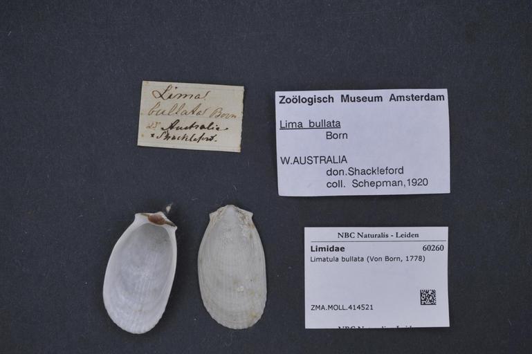 | Keywords: Naturalis Biodiversity Center - ZMA.MOLL.414521 - Limatula bullata (Von Born, 1778) - Limidae - Mollusc shell.jpeg artwork Dimensions artwork Document type Limidae Limatula Individual count Infraspecific epithet Infraspecific rank Institution Naturalis Kind of unit artwork Kind of unit specimen shell Life stage Medium artwork Nomenclatural code Source institute Zoölogisch Museum Amsterdam Scale the width of the text on the species/QR-code label is 38 mm Occurrence ID page Other fields Other versions artwork Permission license Naturalis donation CC-0 Mollusca Publication location Scientific name Limatula bullata Von Born 1778 Scientific name authorship Von Born 1778 Source url http //bioportal naturalis nl Specific epithet bullata State or province Subject keywords artwork Subject keywords publication Title artwork Title publication Type status Uploaded with GWToolset Naturalis_Biodiversity_Center_-_ZMA MOLL 414521_-_Limatula_bullata_ Von_Born _1778 _-_Limidae_-_Mollusc_shell http //medialib naturalis nl/file/id/ZMA MOLL 414521/format/large Molluscs at Naturalis from the Zoölogisch Museum Amsterdam Media donated by Naturalis Biodiversity Center Limatula bullata Limatula |