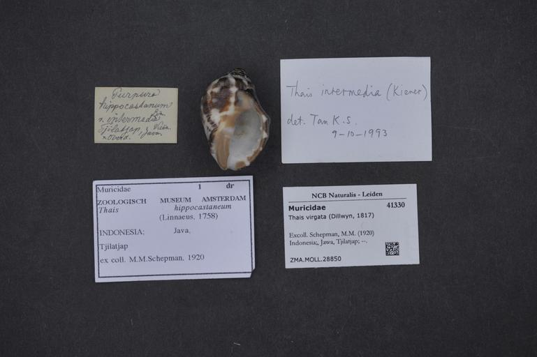 | Keywords: Naturalis Biodiversity Center - ZMA.MOLL.28850 1 - Thais virgata (Dillwyn, 1817) - Muricidae - Mollusc shell.jpeg artwork Dimensions artwork Document type Muricidae subfamily Rapaninae Thais Individual count Infraspecific epithet Infraspecific rank Institution Naturalis Kind of unit artwork Kind of unit specimen shell Life stage Indonesia; Jawa Tjilatjap Medium artwork Nomenclatural code Scale the width of the text on the species/QR-code label is 38 mm Occurrence ID page Neogastropoda Other fields Other versions artwork Permission license Naturalis donation CC-0 Mollusca Publication location Scientific name Thais virgata Dillwyn 1817 Scientific name authorship Dillwyn 1817 Source url http //bioportal naturalis nl Specific epithet virgata State or province Jawa Subject keywords artwork Subject keywords publication Title artwork Title publication Type status Uploaded with GWToolset Naturalis_Biodiversity_Center_-_ZMA MOLL 28850_1_-_Thais_virgata_ Dillwyn _1817 _-_Muricidae_-_Mollusc_shell http //medialib naturalis nl/file/id/ZMA MOLL 28850_1/format/large Media donated by Naturalis Biodiversity Center Molluscs at Naturalis from the Zoölogisch Museum Amsterdam Thais virgata |