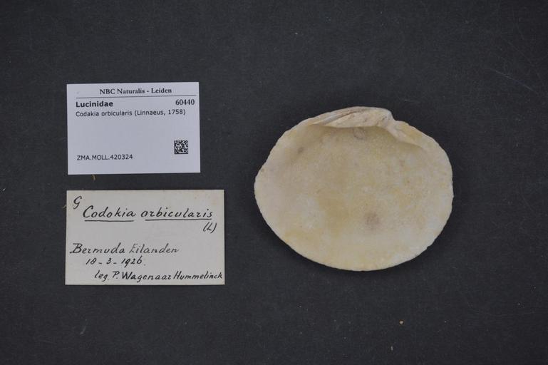 | Keywords: Naturalis Biodiversity Center - ZMA.MOLL.420324 - Codakia orbicularis (Linnaeus, 1758) - Lucinidae - Mollusc shell.jpeg artwork Dimensions artwork Document type Lucinidae subfamily Lucininae Codakia Individual count Infraspecific epithet Infraspecific rank Institution Naturalis Kind of unit artwork Kind of unit specimen shell Life stage Medium artwork Nomenclatural code Source institute Zoölogisch Museum Amsterdam Scale the width of the text on the species/QR-code label is 38 mm Occurrence ID page Other fields Other versions artwork Permission license Naturalis donation CC-0 Mollusca Publication location Scientific name Codakia orbicularis Linnaeus 1758 Scientific name authorship Linnaeus 1758 Source url http //bioportal naturalis nl Specific epithet orbicularis State or province Subject keywords artwork Subject keywords publication Title artwork Title publication Type status Uploaded with GWToolset Naturalis_Biodiversity_Center_-_ZMA MOLL 420324_-_Codakia_orbicularis_ Linnaeus _1758 _-_Lucinidae_-_Mollusc_shell http //medialib naturalis nl/file/id/ZMA MOLL 420324/format/large Molluscs at Naturalis from the Zoölogisch Museum Amsterdam Media donated by Naturalis Biodiversity Center Codakia orbicularis Codakia |