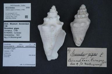 | Keywords: Naturalis Biodiversity Center - ZMA.MOLL.50763 - Lobatus gigas (Linnaeus, 1758) - Strombidae - Mollusc shell.jpeg artwork Dimensions artwork Document type Strombidae Lobatus Individual count Infraspecific epithet Infraspecific rank Institution Naturalis Kind of unit artwork Kind of unit specimen shell Life stage Curaçao West Indies Caracas Bay; 1921 Medium artwork Nomenclatural code Source institute Zoölogisch Museum Amsterdam Scale the width of the text on the species/QR-code label is 38 mm Occurrence ID page Other fields Other versions artwork Permission license Naturalis donation CC-0 Mollusca Publication location Scientific name Lobatus gigas Linnaeus 1758 Scientific name authorship Linnaeus 1758 Source url http //bioportal naturalis nl Specific epithet gigas State or province Curaçao Subject keywords artwork Subject keywords publication Title artwork Title publication Type status Uploaded with GWToolset Naturalis_Biodiversity_Center_-_ZMA MOLL 50763_-_Lobatus_gigas_ Linnaeus _1758 _-_Strombidae_-_Mollusc_shell http //medialib naturalis nl/file/id/ZMA MOLL 50763/format/large Molluscs at Naturalis from the Zoölogisch Museum Amsterdam Media donated by Naturalis Biodiversity Center Eustrombus gigas Lobatus |