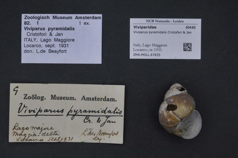 | Keywords: Naturalis Biodiversity Center - ZMA.MOLL.67835 - Viviparus pyramidalis Cristofori & Jan - Viviparidae - Mollusc shell.jpeg  artwork Dimensions artwork Document type Viviparidae subfamily Viviparinae Viviparus Individual count Infraspecific epithet Infraspecific rank Institution Naturalis Kind of unit artwork Kind of unit specimen shell Life stage Italy Lago Maggiore Locarco ; ix-1931 stn new Medium artwork Nomenclatural code Source institute Zoölogisch Museum Amsterdam Scale the width of the text on the species/QR-code label is 38 mm Occurrence ID page Other fields Other versions artwork Permission license Naturalis donation CC-0 Mollusca Publication location Scientific name Viviparus pyramidalis Cristofori Jan Scientific name authorship Cristofori Jan Source url http //bioportal naturalis nl Specific epithet pyramidalis State or province Subject keywords artwork Subject keywords publication Title artwork Title publication Type status Uploaded with GWToolset Naturalis_Biodiversity_Center_-_ZMA MOLL 67835_-_Viviparus_pyramidalis_Cristofori_ _Jan_-_Viviparidae_-_Mollusc_shell http //medialib naturalis nl/file/id/ZMA MOLL 67835/format/large Molluscs at Naturalis from the Zoölogisch Museum Amsterdam Media donated by Naturalis Biodiversity Center Viviparus pyramidalis Viviparus |