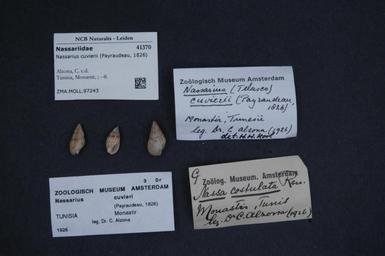 | Keywords: Naturalis Biodiversity Center - ZMA.MOLL.97243 - Nassarius cuvierii (Payraudeau, 1826) - Nassariidae - Mollusc shell.jpeg artwork Dimensions artwork Document type Nassariidae subfamily Nassariinae Nassarius Individual count Infraspecific epithet Infraspecific rank Institution Naturalis Kind of unit artwork Kind of unit specimen shell Life stage Tunisia Monastir Medium artwork Nomenclatural code Collection remarks Moll Source institute Zoölogisch Museum Amsterdam Scale the width of the text on the species/QR-code label is 38 mm Occurrence ID page Other fields Other versions artwork Permission license Naturalis donation CC-0 Mollusca Publication location Scientific name Nassarius cuvierii Payraudeau 1826 Scientific name authorship Payraudeau 1826 Source url http //bioportal naturalis nl Specific epithet cuvierii State or province Monastir Subject keywords artwork Subject keywords publication Title artwork Title publication Type status Uploaded with GWToolset Naturalis_Biodiversity_Center_-_ZMA MOLL 97243_-_Nassarius_cuvierii_ Payraudeau _1826 _-_Nassariidae_-_Mollusc_shell http //medialib naturalis nl/file/id/ZMA MOLL 97243/format/large Molluscs at Naturalis from the Zoölogisch Museum Amsterdam Media donated by Naturalis Biodiversity Center Nassarius cuvierii Nassarius |