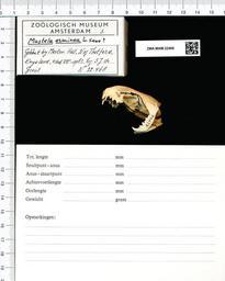 | Keywords: Naturalis Biodiversity Center - ZMA.MAM.22468 lat - Mustela erminea Linnaeus - skull.jpeg artwork Dimensions artwork Document type Mustela Individual count 1 Infraspecific epithet Infraspecific rank Institution Naturalis Kind of unit artwork Kind of unit specimen skull Life stage UNITED KINGDOM Thetford Merton Hall Medium artwork Nomenclatural code Occurrence ID page Other fields Other versions artwork Permission license Naturalis donation CC-0 Publication location Scientific name Mustela erminea Linnaeus Scientific name authorship Linnaeus unknown Source url http //bioportal naturalis nl Specific epithet erminea State or province Subject keywords artwork Subject keywords publication Title artwork Title publication Type status Uploaded with GWToolset Naturalis_Biodiversity_Center_-_ZMA MAM 22468_lat_-_Mustela_erminea_Linnaeus_-_skull http //medialib naturalis nl/file/id/ZMA MAM 22468_lat/format/large Mammals at Naturalis from the Zoölogisch Museum Amsterdam Media donated by Naturalis Biodiversity Center Mustela erminea Mustela |