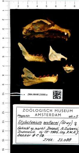 Keywords: Naturalis Biodiversity Center - ZMA.MAM.23088.a lat - Styloctenium wallacei Gray - skull.jpeg artwork Dimensions artwork Document type Styloctenium Individual count Infraspecific epithet Infraspecific rank Institution Naturalis Kind of unit artwork Kind of unit specimen skull Life stage Gekocht op markt Imandi N Sulawesi Indonesia Medium artwork Nomenclatural code Occurrence ID page Other fields Other versions artwork Permission license Naturalis donation CC-0 Publication location Scientific name Styloctenium wallacei Gray Scientific name authorship Gray female Source url http //bioportal naturalis nl Specific epithet wallacei State or province Subject keywords artwork Subject keywords publication Title artwork Title publication Type status Uploaded with GWToolset Naturalis_Biodiversity_Center_-_ZMA MAM 23088 a_lat_-_Styloctenium_wallacei_Gray_-_skull http //medialib naturalis nl/file/id/ZMA MAM 23088 a_lat/format/large Mammals at Naturalis from the Zoölogisch Museum Amsterdam Media donated by Naturalis Biodiversity Center Styloctenium wallacei Styloctenium |