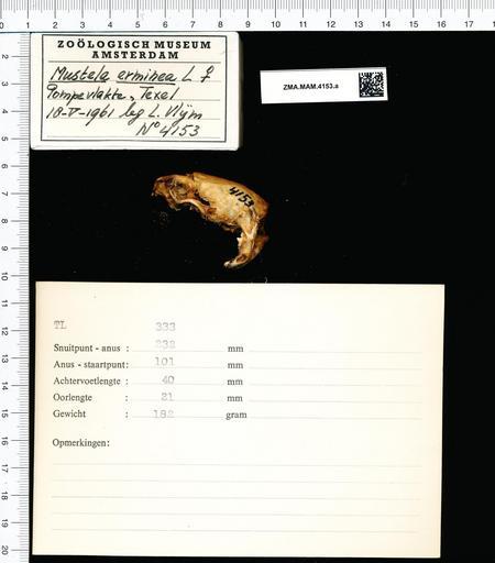 | Keywords: Naturalis Biodiversity Center - ZMA.MAM.4153.a lat - Mustela erminea Linnaeus - skull.jpeg artwork Dimensions artwork Document type Mustela Individual count 1 Infraspecific epithet Infraspecific rank Institution Naturalis Kind of unit artwork Kind of unit specimen skull Life stage Netherlands Noord Holland Texel Medium artwork Nomenclatural code Occurrence ID page Other fields Other versions artwork Permission license Naturalis donation CC-0 Publication location Scientific name Mustela erminea Linnaeus Scientific name authorship Linnaeus female Source url http //bioportal naturalis nl Specific epithet erminea State or province Noord Holland Subject keywords artwork Subject keywords publication Title artwork Title publication Type status Uploaded with GWToolset Naturalis_Biodiversity_Center_-_ZMA MAM 4153 a_lat_-_Mustela_erminea_Linnaeus_-_skull http //medialib naturalis nl/file/id/ZMA MAM 4153 a_lat/format/large Mammals at Naturalis from the Zoölogisch Museum Amsterdam Media donated by Naturalis Biodiversity Center Mustela erminea Mustela |