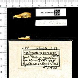 | Keywords: Naturalis Biodiversity Center - ZMA.MAM.52271 lat - Leptonycteris curasoae - skull.jpeg artwork Dimensions artwork Document type Leptonycteris Individual count 1 Infraspecific epithet Infraspecific rank Institution Naturalis Kind of unit artwork Kind of unit specimen skull Life stage Grot Plantage Noordkant CuraƧao Medium artwork Nomenclatural code Occurrence ID page Other fields Other versions artwork Permission license Naturalis donation CC-0 Publication location Scientific name Leptonycteris curasoae Scientific name authorship male Source url http //bioportal naturalis nl Specific epithet curasoae State or province Subject keywords artwork Subject keywords publication Title artwork Title publication Type status Uploaded with GWToolset Naturalis_Biodiversity_Center_-_ZMA MAM 52271_lat_-_Leptonycteris_curasoae_-_skull http //medialib naturalis nl/file/id/ZMA MAM 52271_lat/format/large Mammals at Naturalis from the Zoƶlogisch Museum Amsterdam Media donated by Naturalis Biodiversity Center Leptonycteris curasoae Leptonycteris |