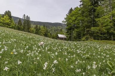 Keywords: nature field meadow flowers blooming blossoms white green lush spring season hut cabin shelter wooden traditional trees mountains highlands alpine grass outdoor pasture animal dog pet playful jumping