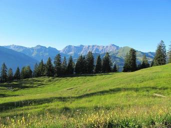 Keywords: nature green mountains meadow switzerland forest blue sky graubünden