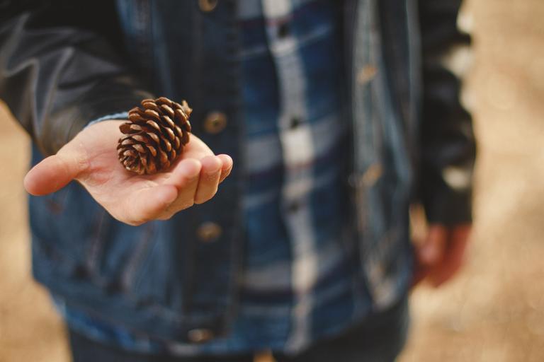Keywords: nature hand outside bokeh pinecone