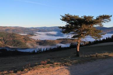 Keywords: nature outdoor tree plant mountains highland hills landscape view fog mist valley above vegetation sunlight scenic panoramic environment