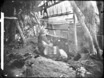 | Keywords: Navajo blanket weaver with loom, ca.1900 (CHS-4725).jpg en <br> Navajo blanket weaver with loom ca 1900 Photograph of a Navajo blanket weaver with loom ca 1900 Sitting in the shade of the thatched dwelling the blanket maker faces the loom placed such that light shines through it A large rectangular opening can be seen to the right of the loom with large boards at the base of the opening Several slanted poles can be seen throughout the dwelling used for support A blanket rope pottery baskets and fleece lay on the ground around the weaver In the background at left large vines grow along the wall Call number CHS-4725 Photographer James George Wharton Filename CHS-4725 Coverage date circa 1900 Part of collection California Historical Society Collection 1860-1960 Type images Part of subcollection Title Insurance and Trust and C C Pierce Photography Collection 1860-1960 Repository name USC Libraries Special Collections Format glass plate negatives Microfiche number 1-163- Archival file chs_Volume98/CHS-4725 tiff Repository address Doheny Memorial Library Los Angeles CA 90089-0189 Geographic subject country USA Format aacr2 2 photographs glass photonegative photoprint b w ; 17 x 22 cm Rights Digitally reproduced by the USC Digital Library; From the California Historical Society Collection at the University of Southern California Subject adlf housing areas Project USC Accession number 4725 Repository email specol usc edu Identifying number unidentified no James-1103 Contributing entity California Historical Society Date created circa 1900 Publisher of the digital version University of Southern California Libraries Format aat photographic prints; photographs Legacy record ID chs-m17036; USC-1-1-1-13946 Access conditions Send requests to address or e-mail given Phone 213 821-2366; fax 213 740-2343 Subject file heading Indians -- Navajo Subject lcsh Indians of North America; Navajo Indians; Dwellings Subject Navajo Indians circa 1900 date created James George Wharton http //digitallibrary usc edu/cdm/ref/collection/p15799coll65/id/17051 PD-old-70-1923 Images from USC Digital Library uploaded by Fæ California Historical Society Collection 1860-1960 Glass plate negatives Navajo weaving Photographs by George Wharton James Sitting in the shade Historical photographs of Navajo people |