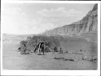 | Keywords: Navajo family at their hogan in Blue Canyon, showing a horse near the entrance, ca.1900 (CHS-4734).jpg en <br> Navajo family at their hogan in Blue Canyon showing a horse near the entrance ca 1900 Photograph of Navajo family at their hogan in Blue Canyon showing a horse near the entrance ca 1900 The hogan consists of tented rough-hewn timbers covered with leafy branches At the entrance of the hogan two small children can be seen standing near a thick pole used as a support A man can be seen seated to the right of the entrance Further to the right a woman is visible sitting beside a group of pots and cooking utensils In the foreground at center a large horse can be seen To the left of the horse a woman is visible holding an object in her hands Behind the hogan a small adobe structure can be seen At least two people are sitting behind the structure at left The canyon wall rises at right behind the hogan Call number CHS-4734 Photographer James George Wharton Filename CHS-4734 Coverage date circa 1900 Part of collection California Historical Society Collection 1860-1960 Type images Part of subcollection Title Insurance and Trust and C C Pierce Photography Collection 1860-1960 Repository name USC Libraries Special Collections Format glass plate negatives Microfiche number 1-174- Archival file chs_Volume98/CHS-4734 tiff Repository address Doheny Memorial Library Los Angeles CA 90089-0189 Geographic subject country USA Format aacr2 2 photographs glass photonegative photoprint b w ; 17 x 22 cm Rights Digitally reproduced by the USC Digital Library; From the California Historical Society Collection at the University of Southern California Subject adlf housing areas Project USC Accession number 4734 Repository email specol usc edu Identifying number unidentified no James-1114 Contributing entity California Historical Society Date created circa 1900 Publisher of the digital version University of Southern California Libraries Format aat photographic prints; photographs Legacy record ID chs-m17045; USC-1-1-1-13946 Geographic subject canyons Blue Canyon Access conditions Send requests to address or e-mail given Phone 213 821-2366; fax 213 740-2343 Subject file heading Indians -- Navajo Subject lcsh Indians of North America; Navajo Indians; Dwellings Subject Navajo Indians circa 1900 date created James George Wharton http //digitallibrary usc edu/cdm/ref/collection/p15799coll65/id/17060 PD-old-70-1923 Images from USC Digital Library uploaded by Fæ California Historical Society Collection 1860-1960 Glass plate negatives Historical photographs of Navajo people Photographs by George Wharton James |