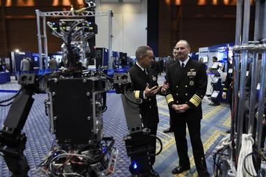 | Keywords: Naval Future Force Science and Technology EXPO 150204-N-PO203-443.jpg en Rear Adm Mat Winter chief of naval research talks to Chief of Naval Operations Adm Jonathan Greenert about the Office of Naval Research ONR -sponsored Shipboard Autonomous Firefighting Robot SAFFiR while touring the exhibit hall during the Naval Future Force Science and Technology S T; EXPO The expo is the Office of Naval Research ™s premier biennial event that provides attendees access to naval leadership who discuss the objectives of the revised Naval S T; Strategy status of key programs and new research opportunities available U S Navy photo by John F Williams/Released 2015-02-04 John Williams https //www dvidshub net/image/1752301 150204-N-PO203-443 2015-02-04 21 13 WASHINGTON DC US PD-USGov-Military-Navy Jonathan W Greenert Office of Naval Research Images from DoD uploaded by Fæ |