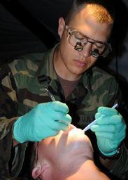 | Keywords: Naval Mobile Construction Battalion 7 DVIDS101583.jpg en Lt Matthew Dent Naval Mobile Construction Battalion 7 dental officer performs a dental exam on a Seabee during the battalions unit field exercise While the battalion is in the field medical and dental personnel still provide services in the battalion aid station ranging from routine exams to emergency medical support NMCB-7 is out in the field on its FEX to test its deployment readiness 2008-06-22 Petty Officer 2nd Class Michael Lavender https //www dvidshub net/image/101583 080622-N-+++++-008 2008-07-09 04 26 CAMP SHELBY MS US PD-USGov-Military-Navy Camp Shelby Images from DoD uploaded by Fæ |