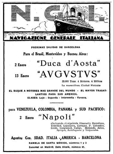 | Keywords: Navigazione-Generale-Italiana-1927.jpg it Navigazione Generale Italiana annuncio pubblicitario della partenza delle motonavi DUCA D'AOSTA e AUGUSTUS dal porto di Napoli il 2 e il 13 gennaio 1927 dirette in Venezuela Colombia Panamà e Sud Pacifico Agente Gen SDAD - Italia - America - Barcellona Rambla de Santa Monica 1 e 3 succursale a Madrid calle Alcalà 47 1927-12-29 La Vanguardia Barcelona 29 diciembre 1927 pag 10 Navigazione Generale Italiana PD-old La Vanguardia advertisements 1927 Advertisements in Spain 1927 Shipping line advertisements 1927 advertisements in Spain Navigazione Generale Italiana |