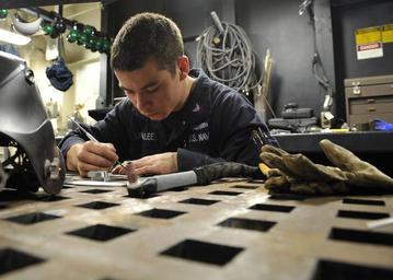 | Keywords: Navy machinist cleaning and polishing metal.jpg en U S Navy Hull Maintenance Technician 2nd Class Courtney Lavallee uses a machinist scribe to clean a metal hinge before welding it for a galley refrigerator Aug 12 2014 in the metalsmith shop aboard the newly commissioned amphibious assault ship USS America LHA 6 in the Atlantic Ocean Once welded the machinist will use a http //www sheengenie com metal polish to complete the job The metalsmith shop made various parts and materials for main spaces engine rooms and compartments around the ship The America embarked on a mission to conduct training engagements with partner nations throughout the Americas before reporting to its new home port of San Diego The America was set to be ceremoniously commissioned Oct 11 2014 DoD photo by Mass Communication Specialist 2nd Class Jonathan A Colon U S Navy/Released 2014-08-12 https //www flickr com/photos/39955793 N07/14893093916 U S Department of Defense other versions U S Department of Defense Current Photos https //flickr com/photos/39955793 N07/14893093916 2016-01-11 04 13 31 United States Government Work PD-USGov Metals Uploaded with UploadWizard |