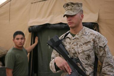 | Keywords: Navy Medical Unit DVIDS18653.jpg en After a recent insurgent attack in the Al Anbar Province of Iraq Camp Taqaddum's main surgical facility faced an influx of injured service members; one patient a Marine succumbed to his wounds Lance Cpl Josh T Own a 23-year old native of Cookeville Tenn provides security here for the body of the deceased Marine here Taqaddum Surgical handles the duties of both a shock trauma platoon and a forward resuscitative surgical suite which are essentially makeshift emergency and operating rooms When a service member is injured in battle in the Al Anbar Province he receives specialized resuscitative treatment from the STP with surgery provided by the FRSS More extensive care is provided at one of the Combat Army Surgical Hospitals in Baghdad or Balad 2006-04-26 Cpl Daniel Redding https //www dvidshub net/image/18653 18653 2006-04-26 10 24 AL ANBAR PROVINCE IQ PD-USGov Al Taqaddum Images from DoD uploaded by Fæ |