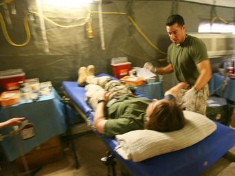| Keywords: Navy Medical Unit DVIDS18656.jpg en After an insurgent attack in the Al Anbar Province of Iraq medical personnel like Petty Officer 2nd Class Victor Ludi must handle an influx of injured service members at Camp Taqaddum's main surgical facility Ludi begins to draw blood from a Marine at Taqaddum Surgical Since taking over the facility March 3 Ludi a 30-year-old native of Las Vegas N M and the rest of the unit have used the emergency blood donation system seven times including a stretch of four out of five days recently Taqaddum Surgical handles the duties of both a shock trauma platoon and a forward resuscitative surgical suite which are essentially makeshift emergency and operating rooms When a service member is injured in battle he receives specialized resuscitative treatment from the STP with surgery provided by the FRSS More extensive care is provided at one of the Combat Army Surgical Hospitals in Baghdad or Balad 2006-04-26 1st Lt Robert Shuford https //www dvidshub net/image/18656 18656 2006-04-26 10 24 AL ANBAR PROVINCE IQ PD-USGov Al Taqaddum Images from DoD uploaded by Fæ |