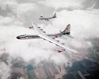 | Keywords: NB-36H with B-50, 1955 - DF-SC-83-09332.jpeg An air-to-air view of the Convair NB-36H Peacemaker experimental aircraft s/n 51-5712 and a Boeing B-50 Superfortress chase plane during research and development taking place at the Convair plant at Forth Worth Texas USA The NB-36H was originally a B-36H-20-CF damaged at Carswell Air Force Base also at Forth Worth by a tornado on 1 September 1952 This plane was called the Nuclear Test Aircraft NTA and was redesignated XB-36H then NB-36H and was modified to carry a three megawatt air-cooled nuclear reactor in its bomb bay The reactor named the Aircraft Shield Test Reactor ASTR was operational but did not power the plane The NTA completed 47 test flights and 215 hours of flight time during 89 of which the reactor was operated between July 1955 and March 1957 over New Mexico and Texas This was the only known airborne reactor experiment by the USA with an operational nuclear reactor on board The NB-36H was scrapped at Fort Worth in September 1958 when the Nuclear Aircraft Program was abandoned U S Defenseimagery mil photo no DF-SC-83-09332 USAF Assessments 1 Convair X-6 PD-USGov original upload log wikitable date/time username resolution size edit summary ---- 2008-10-07T16 17 50Z User Cobatfor 3000×2400 3 21Gb <nowiki> An air-to-air view of the Convair NB-36H Peacemaker experimental aircraft s/n 51-5712 and a Boeing B-50 Superfortress chase plane during research and development taking place at the Convair plant at Forth Worth Texas </nowiki> Convair B-36 Peacemaker Boeing B-50 Superfortress Unpainted aircraft Aerial photographs of military aircraft in flight 51-5712 aircraft |