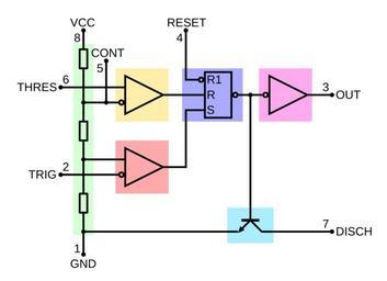 | Keywords: NE555 Bloc Diagram.svg The NE555 contains 24 bipolar transistors two diodes and 15 resistors that form six functional blocks Between the supply voltage VCC + and the ground GND - is a voltage divider consisting of three identical resistors which when connected not from the outside the two reference voltages ¹ / 3 VCC and ² / 3 VCC supplies The latter is at the terminal pin Control Voltage available The block diagram and schematic that area is highlighted in green Two comparators are each connected to one of the reference voltages while the other two inputs of which are fed directly to the terminals of trigger or threshold The block diagram in yellow and orange A flip-flop deposited in the color purple stores the state of the timer and is controlled by the two comparators Via the reset terminal overrides the other two inputs the flip-flop and therefore the entire timer device be reset at any time At the output of flip-flop followed by an output stage with totem-pole output that can be loaded at the port output with up to 200 mA Shown in the color pink Parallel to the output stage of a transistor is connected the collector is located on the discharge port The transistor in the circuit diagram is a light blue background always energized when the output is low level Der NE555 enthält 24 Bipolartransistoren zwei Dioden und 15 Widerstände die zusammen sechs Funktionsblöcke bilden Zwischen der Versorgungsspannung V<sub>CC</sub> + und der Masse GND ˆ’ befindet sich ein Spannungsteiler aus drei identischen Widerständen der wenn nicht von außen beschaltet die beiden Referenzspannungen ¹/<sub>3</sub> V<sub>CC</sub> und ²/<sub>3</sub> V<sub>CC</sub> liefert Letztere ist am Anschluss-Pin Control Voltage verfügbar Im Blockdiagramm und Schaltplan ist jener Bereich grün hinterlegt Zwei Komparatoren sind jeweils mit einer der Referenzspannungen verbunden während die beiden anderen Eingänge direkt auf die Anschlüsse Trigger bzw Threshold geführt sind Im Blockdiagramm gelb und orange hinterlegt Ein Flipflop in der Farbe lila hinterlegt speichert den Zustand des Timers und wird über die beiden Komparatoren angesteuert à ber den Reset-Anschluss der die beiden anderen Eingänge übersteuert kann das Flipflop und damit der gesamte Timer-Baustein jederzeit zurückgesetzt werden Am Ausgang des Flipflops folgt eine Ausgangsstufe mit Totem-Pole-Ausgang die am Anschluss Output mit bis zu 200 mA belastet werden kann In der Farbe Rosa dargestellt Parallel zur Ausgangsstufe ist ein Transistor angeschlossen dessen Kollektor am Anschluss Discharge liegt Dieser Transistor im Schaltplan hellblau hinterlegt ist immer dann durchgeschaltet wenn der Ausgang Low-Pegel hat Own 2007-09-23 BlanchardJ thumb left Bipolar circuit diagramthumb left CMOS circuit diagram Created with Inkscape ElCompLib 555 timer IC |