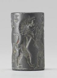 | Keywords: Near Eastern - Cylinder Seal with Four Beasts in Combat - Walters 42814 - Side D.jpg The scene on this seal depicts a lion attacking a horned quadruped A second horned quadruped is shown being attacked by a winged monster with talons Between these two sets of battling creatures is a small juglet suspended in the field There is a cuneiform inscription in two registers and above the registers is a disk with a star in it cradled in an inverted crescent between 1970 1670 BC early Old Babylonian; Babylon I hematite cm 2 1 2 accession number 42 814 27892 Sadie Jones Mrs Henry Walters New York date and mode of acquisition unknown Sale Joseph Brummer New York 1941 Walters Art Museum 1941 by purchase Museum purchase 1941 Inscription place of origin Mesopotamia Walters Art Museum license Cylinder seals in the Walters Art Museum Art of the ancient Near East Media contributed by the Walters Art Museum needs category review |