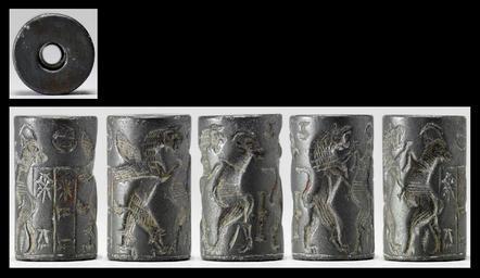 | Keywords: Near Eastern - Cylinder Seal with Four Beasts in Combat - Walters 42814 - View A.jpg The scene on this seal depicts a lion attacking a horned quadruped A second horned quadruped is shown being attacked by a winged monster with talons Between these two sets of battling creatures is a small juglet suspended in the field There is a cuneiform inscription in two registers and above the registers is a disk with a star in it cradled in an inverted crescent between 1970 1670 BC early Old Babylonian; Babylon I hematite cm 2 1 2 accession number 42 814 27892 Sadie Jones Mrs Henry Walters New York date and mode of acquisition unknown Sale Joseph Brummer New York 1941 Walters Art Museum 1941 by purchase Museum purchase 1941 Inscription place of origin Mesopotamia Walters Art Museum license Cylinder seals in the Walters Art Museum Art of the ancient Near East Media contributed by the Walters Art Museum needs category review |