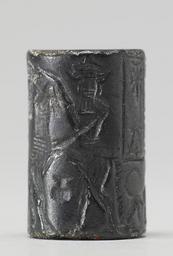 | Keywords: Near Eastern - Cylinder Seal with Enkidu Vanquishing the Bull of Heaven - Walters 42786 - Side G.jpg At the center of the depicted scene is a handled jug on a stand Flanking this motif on both sides is an animal contest motif with a bearded hero/bull-man in horned headdress battling a bull-man At the edge of the scene is a cuneiform inscription in two registers at the top and beneath it is a small four legged animal with a long tail that curls upward between 1970 1670 BC early Old Babylonian; Babylon I hematite cm 2 3 1 4 accession number 42 786 3746 Sadie Jones Mrs Henry Walters New York date and mode of acquisition unknown Sale Joseph Brummer New York 1941 Walters Art Museum 1941 by purchase Museum purchase 1941 Inscription place of origin Mesopotamia Walters Art Museum license Cylinder seals in the Walters Art Museum Art of the ancient Near East Media contributed by the Walters Art Museum needs category review |