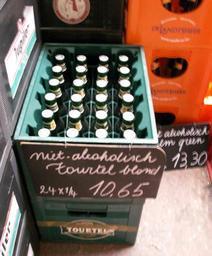 | Keywords: NearBeersInWarehouse.JPG en A picture of some near-beers sold at the local warehouse Mark the Tourtel Jupiler NA and Palm Green sold out which are all near-beers Note that th price tag is in Euro and that 1/4 means 1/4 liter or 25cl own KVDP 2008-07-05 Bottle crates low quality |