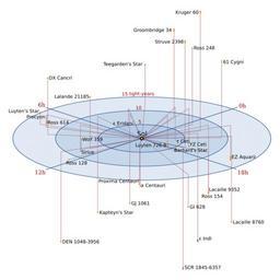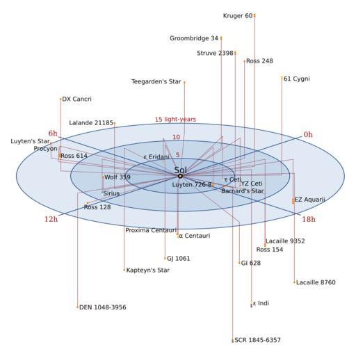 | Keywords: Nearby Stars (14ly Radius).svg A spatial representation of every star within 14 light-years of Sol There are 32 known stars in this region including Sol The stars are coloured according to the spectral type which may not reflect the actual colour Please see this Wikipedia article for the listing of stars If a star is double or triple the stars are shown stacked vertically the actual position is the star closest to the centre plane The stars on this map may not all be visible to the naked eye as many are dwarf stars Some of this information may be preliminary and not entirely accurate as a result The coordinate system is right ascension and declination Hours of RA are marked as well as distance in multiples of 5 light-years self-made Mathematica Inkscape <br>See also http //www daviddarling info/encyclopedia/S/starsnearest html 2008-04-06 Inductiveload Other versions <gallery> File Nearby Stars 14ly Radius -ru svg Russian File Nearby Stars 14ly Radius -sl svg Slovenščina File Nearby Stars 14ly Radius uk svg Ukrainian/Ук аїнською File Nearby Stars 14ly Radius _ger svg German </gallery> Other fields + 6 Diagrams i Mathematica Code <pre><nowiki> raToTheta h_ m_ s_ 15 h + 15/60 m + 15/3600 s; decToPhi d_ m_ s_ 90 - d + m/60 + s/3600 Signd ; Returns celestial RA and Dec as radians in spherical coords celestialToSph rah_ ram_ ras_ dd_ dm_ ds_ dist_ name_ raToTheta rah ram ras Degree decToPhi dd dm ds Degree dist ; Map Spherical coords to Cartesian sphereMap phi_ theta_ r_ r Sintheta Cosphi r Sintheta Sinphi r Costheta ; Produce a circle of radius r offset in the z axis by z offsetCircler_ z_ ParametricPlot3D r Cost r Sint z t 0 2 Pi ; Star list as RA Dec Distance Name starList 0 0 0 0 0 0 0 Sun 14 29 43 -62 40 46 4 2421 Proxima Centauri 14 39 36 5 -60 50 02 4 3650 \Alpha Centauri 17 39 35 1 4 41 36 5 9630 Barnard's Star 10 49 18 7 -53 19 10 6 5880 Luhman 16 10 56 29 2 7 0 53 7 7825 Wolf 359 11 3 20 2 35 58 12 8 2905 Lalande 21185 6 45 8 8 -16 42 58 8 5828 Sirius 1 39 1 3 -17 57 01 8 7280 Luyten 726-8 15 41 51 5 -22 50 25 9 3000 Wise 1541-2250 18 49 49 4 -23 50 10 9 6183 Ross 154 23 41 54 7 44 10 30 10 322 Ross 248 3 32 55 8 -9 27 30 10 522 \Epsilon Eridani 23 5 52 -35 51 11 10 742 Lacaille 9352 11 47 44 4 0 48 16 10 919 Ross 128 22 38 33 4 -15 18 7 11 266 EZ Aquarii 07 39 18 1 5 13 30 11 402 Procyon 21 06 53 9 38 44 58 11 403 61 Cygni 18 42 46 7 59 37 49 11 525 Struve 2398 1 18 22 9 44 1 23 11 624 Groombridge 34 22 3 21 7 -56 47 10 11 824 \Epsilon Indi 8 29 49 5 26 46 37 11 826 DX Cancri 1 44 4 1 -15 56 15 11 887 \Tau Ceti 3 35 59 7 -44 30 45 11 991 GJ 1061 1 12 30 6 -16 59 56 12 132 YZ Ceti 07 27 24 5 5 13 33 12 366 Luyten's Star 2 53 0 9 16 52 53 12 571 Teegarden's Star 18 45 5 3 -63 57 48 12 571 SCR 1845-6357 5 11 40 6 -45 1 6 12 777 Kapteyn's Star 21 17 15 3 -38 52 03 12 870 Lacaille 8760 22 27 59 5 57 41 45 13 149 Kruger 60 10 48 14 7 -39 56 06 13 167 DEN 1048-3956 6 29 23 4 -2 48 50 13 349 Ross 614 ; Get stars in phi theta r format starsDeg MapcelestialToSph starList 1; Map into the Cartesian space starPlot sphereMap / starsDeg; stars ListPointPlot3DstarPlot; labels Table Graphics3D Text starListi 4 starPloti -1 1 0 i 1 LengthstarList ; posLines Table Graphics3D Orange Line 0 0 0 starPloti 1 starPloti 2 0 starPloti i 2 LengthstarList ; gridhours Graphics3D Line -20 0 0 20 0 0 Line 0 -20 0 0 20 0 ; gridly offsetCircle5 0 offsetCircle10 0 offsetCircle15 0 ; viewDist 20000; Distance of Viewpoint viewRA 225 Degree; RA of viewpoint viewDec 20 Degree; Dec of viewpoint Show labels posLines stars gridhours gridly BaseStyle -> FontFamily -> DejaVu Sans PlotRange -> -15 15 -15 15 -12 12 SphericalRegion -> True Axes -> False BoxRatios -> 1 1 1 Boxed -> False ViewPoint -> SinviewRA viewDist CosviewRA viewDist SinviewDec viewDist ViewVertical -> 0 0 1 AxesLabel -> x y z ImageSize -> 1000 </nowiki></pre> Solar neighborhood SVG diagrams in English |