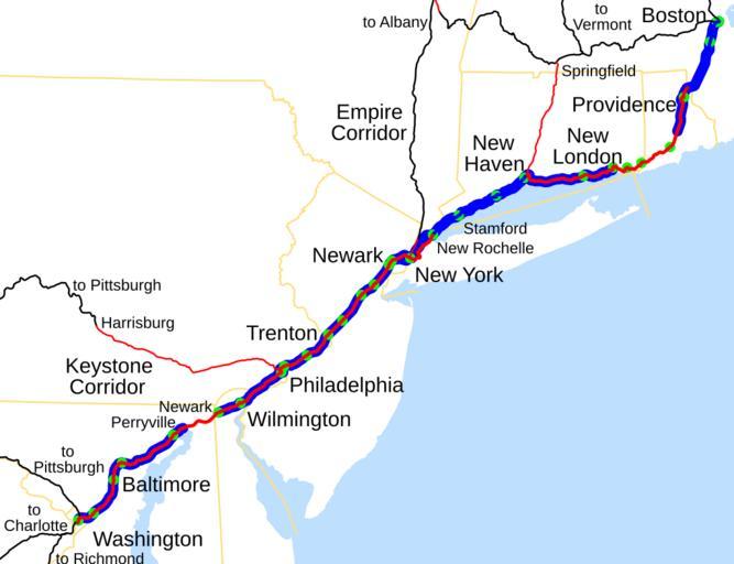| Keywords: NEC map.svg Map of the Northeast Corridor traced on USGS topos Legend Red - Amtrak ownership Blue - NEC commuter services and NEC commuter rail agency ownership Black - off-NEC Amtrak lines not owned by Amtrak Green - stations on the NEC Amtrak only User SPUI own ; USGS topographic maps 2005-10-25 spuimap Rail transport maps of the United States Amtrak maps Maps of the Pennsylvania Railroad Maps of the New York New Haven and Hartford Railroad | ||||