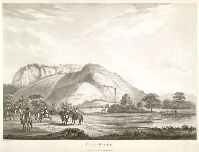 Keywords: Neel Droog.jpg en Artist Allan Sir Alexander 1764-1820 Medium Aquatint Date 1794 This uncoloured aquatint is taken from plate 5 of Captain Alexander Allan's 'Views in the Mysore Country' The fort of Nilagiridurg three miles from Anchettidurg in Tamil Nadu surrendered to a British battalion in July 1792 Allan wrote This place though respectable in itself in point of strength yet not forming a part of the chain of posts then intended to be established was dismantled during the stay of the army in that vicinity Alexander Allan then a Lieutenant in the Madras Native Infantry was not unusual in serving as a surveyor and skilled amateur artist during the third Anglo-Mysore war Many soldiers were accomplished draughtsmen in the 18th century recording and detailing the sites of conflict Allan was fluent in Persian and served in the fourth and final war even being appointed to carry the flag of truce to Mysore-leader Tipu's palace if he surrendered In the event he was with David Baird when Tipu's body was found He later became a director of the East India Company 1794 http //www europeana eu/portal/search html query nilagiridurgam Allan Sir Alexander PD-old-100 Uploaded with UploadWizard Tamil Nadu in the 1790s Geography of Krishnagiri district |