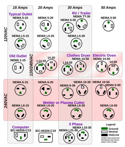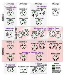 | Keywords: NEMA receptacle pins.svg en A selection of NEMA receptacles showing ground neutral and hot/line pins Earth/ground is dark green neutral is white and hot/line is black Typical modern North American uses for common receptacles are shown in purple Sadly this is not an exhaustive list References Receptacle side shown here http //www nooutage com/nema_configurations htm Plug side shown here http //www refurbups com/Plug-Information Prints smaller than actual size Plugs drawn freehand; mechanical dimensions are very approximate Electrical connections should be positively verified before use as this information was collected from online sources of unknown reliability own Olawlor 2011-07-24 My new version NEMA_simplified_pins svg File NEMA simplified pins svg removes the bottom row's 3-phase power plugs and IEC computer connectors as a way to simplify the table Cc-zero Mains adaptors Electrical parts and components |