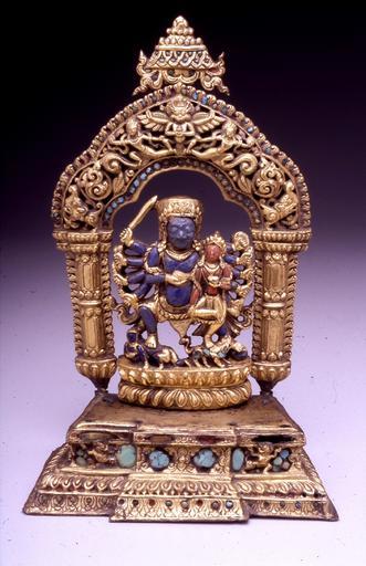 Keywords: Nepalese - Bhairava with Goddess - Walters 543024.jpg This blue god of ferocious form and ten arms is Bhairava the angry manifestation of Shiva In Nepal he is popular with both Hindus and Buddhists and is also known as Mahakala His posture is somewhere in between the militant pratyalidha posture of Bhairava and the bent-kneed posture of Mahakala His stretched left leg is sufficiently bent to balance his spouse on the thigh while the right presses down on his mount who is the man nara Nine of his ten arms radiate symmetrically on either side except one that holds the skull cup against his chest The others hold various weapons and emblems By contrast his spouse only has two arms and sits in the graceful lalitasana posture although not too comfortably Her dangling left leg rests on her lion mount The right hand displays the gesture of charity and the left holds a skull cup century 18 gilt copper alloy lapis lazuli opal coral turquoise cm 25 2 16 5 9 2 accession number 54 3024 39014 de Sedley Gallery New York date and mode of acquisition unknown John and Berthe Ford Baltimore October 1965 by purchase Walters Art Museum 2006 by gift John Berthe Ford 2006 place of origin Nepal Walters Art Museum license Nepalese art in the Walters Art Museum Metalwork of Nepal Bhairava |