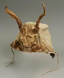 | Keywords: NEPE8790 Bison-Hat.jpg en Bonnet c 1870 This deer antler bonnet or ˜stalking cap ™ is made of bison hide The skull cap has antlers of a two year old white tail deer attached by means of smoked hide The cap was worn when stalking game but would also have been worn during winter medicine dances Bison hide Bos bison deer Odocoileus virginianus H 34 0 W 26 5 cm Nez Perce National Historical Park NEPE 8790 Nez Perce National Historical Park NEPE 8790 Nez Perce 1870 PD-USGov Nez Perce Native American headgear Native American dance regalia Bison clothing Male fur headgear Antlers Native American medicine Fur headgear Fur clothing of Nez Perce people Deer clothing Fur fashion in 1870 |