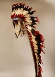 | Keywords: NEPE Head-dress.jpg en War Bonnet and Trailer The headdress was a sign of leadership and honor and was often passed down from generation to generation The headdress and trailer was probably made locally The headdress itself is built around a tan felt cap with twenty-five feathers The head band is beaded with small bells and ermine tails attached to it The trailer has twenty-six eagle feathers attached to a trailer of red trade cloth One of the designs on the trailer is of a whirlwind which Euro-American ™s often call a swastika This is an ancient symbol that appears in artwork around the world Wool eagle feathers brass L 154 W 22 3 cm Nez Perce National Historical Park NEPE 2225 Nez Perce National Historical Park NEPE 2225 Nez Perce National Historical Park 18 PD-USGov Nez Perce War bonnets Facing left Male fur headgear Ermine headgear Feathered headdresses Fur clothing of Nez Perce people |