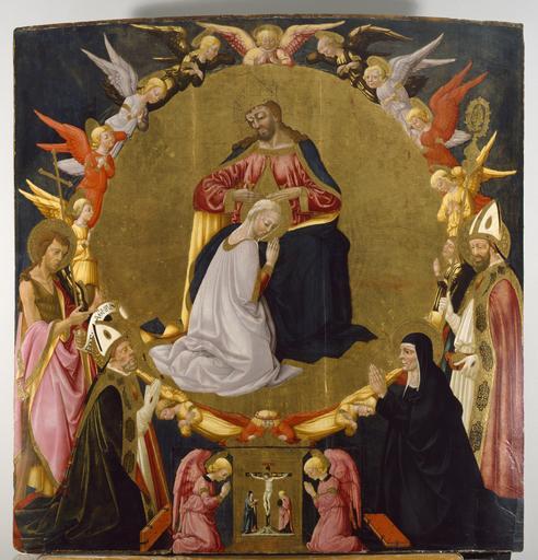 Keywords: Neri di Bicci - The Coronation of the Virgin with Angels and Four Saints - Walters 37675.jpg On this altarpiece Christ places a crown upon the head of his kneeling mother the Virgin Mary an act symbolic of their status as King and Queen of Heaven The golden circle surrounding the couple has been engraved with different tools This ornament suggests the music of the heavenly spheres the movement of the planets believed to produce harmonies which could not be heard by humans Around the circle is a host of worshiping angels; below are Sts John the Baptist perhaps Augustine and his mother Monica and Nicholas of Bari At the bottom of the panel in the center angels kneel on either side of a painted tabernacle depicting the Crucifixion This section was cut and hinged to provide a recess in the altarpiece that may have housed the consecrated Host for use in the Mass For more information on this altarpiece please see Zeri catalogue number 54 pp 87-89 ca 1470 1475 Renaissance tempera and gold leaf on panel Painted surface cm 205 7 201 6 3 2 ; Framed cm 215 3 215 9 20 3 accession number 37 675 35571 Don Marcello Massarenti Collection Rome prior to 1897 mode of acquisition unknown 1897 catalogue no 92 as Neri di Bicci Henry Walters city Baltimore Walters Art Museum Henry Walters Acquired by Henry Walters with the Massarenti Collection 1902 Transcription In scroll held by John the Baptist ECCE AGNIVS place of origin Florence Italy Walters Art Museum license 2D Italian Renaissance paintings in the Walters Art Museum Neri di Bicci Paintings in the Walters Art Museum 15th-century paintings of Coronation of Mary 15th-century donor portraits with Madonna Donor portraits with Coronation of Virgin |