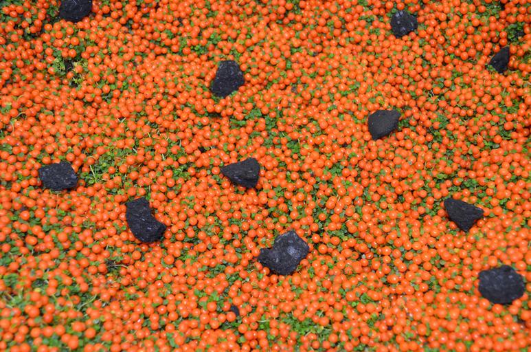 Keywords: nertera lava stone contrast black orange background potted plant houseplant