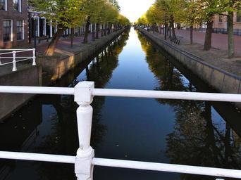 Keywords: netherlands canal waterway water reflections buildings town city urban railing rail trees fall autumn outside