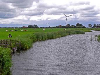 Keywords: netherlands landscape river stream water grass plants nature outside country countryside sky clouds cattle fields rural wind turbines energy summer spring