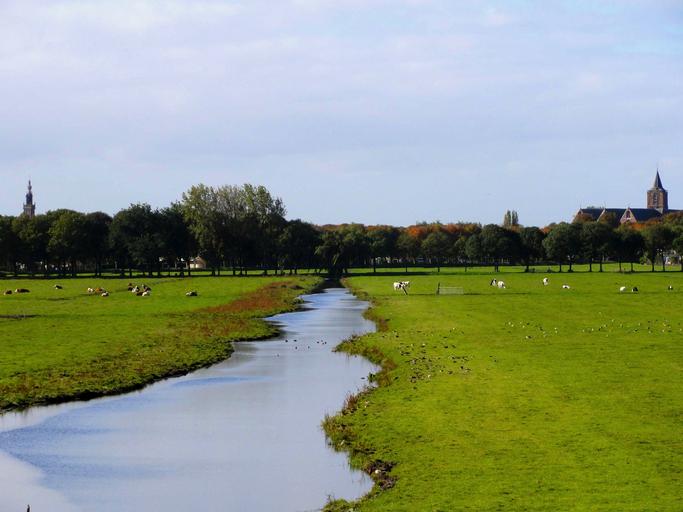 Keywords: netherlands landscape stream water fields grass plants scenic sky clouds cattle churches fall autumn farm rural nature outside country countryside
