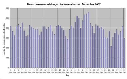 | Keywords: Neue Benutzer im November und Dezember 2007.png Account creations at the German language Wikipedia in Novemver and December 2007 Benutzerneuanmeldungen im November und Dezember 2007 in der deutschsprachigen Wikipedia am 6 Dezember war der Stern-Vergleich an den Kiosken erhältlich Daten <br /> 1 Nov 420 / 2 Nov 368 / 3 Nov 324 / 4 Nov 422 / 5 Nov 436 / 6 Nov 406 / 7 Nov 452 / 8 Nov 374 / 9 Nov 316 / 10 Nov 325 / 11 Nov 427 / 12 Nov 412 / 13 Nov 399 / 14 Nov 384 / 15 Nov 389 / 16 Nov 330 / 17 Nov 363 / 18 Nov 414 / 19 Nov 415 / 20 Nov 388 / 21 Nov 406 / 22 Nov 431 / 23 Nov 363 / 24 Nov 337 / 25 Nov 417 / 26 Nov 430 / 27 Nov 423 / 28 Nov 402 / 29 Nov 381 / 30 Nov 315 / 1 Dez 286 / 2 Dez 388 / 3 Dez 421 / 4 Dez 402 / 5 Dez 460 / 6 Dez 519 / 7 Dez 498 / 8 Dez 399 / 9 Dez 475 / 10 Dez 533 / 11 Dez 543 / 12 Dez 559 / 13 Dez 447 / 14 Dez 417 / 15 Dez 350 / 16 Dez 436 / 17 Dez 424 / 18 Dez 400 / 19 Dez 410 / 20 Dez 389 / 21 Dez 309 / 22 Dez 303 / 23 Dez 366 / 24 Dez 217 / 25 Dez 311 / 26 Dez 350 / 27 Dez 386 / 28 Dez 333 / 29 Dez 367 / 30 Dez 419 / 31 Dez 297 / own 2007-1-5 Toffel <gallery> Image Neue Benutzer November Dezember 2007 png Ältere Version Image Neue Benutzer im November und Dezember 2007 1 PNG Differenzen Image Neue Benutzer im November und Dezember 2007 2 PNG Kombination </gallery> German Wikipedia statistics |