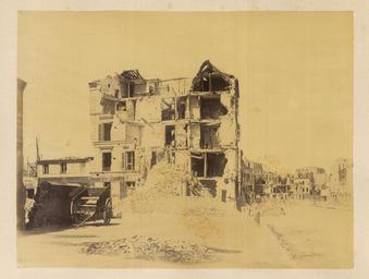 | Keywords: Neuilly. Rue du Roule. Partial View of Destruction in the Streets WDL1317.png Artwork ru Б аквейе Б уно 1823 1875 гг fr Braquehais Bruno 1823-1875 en Braquehais Bruno 1823-1875 zh 布鲁诺·布拉奇海 ,1823-1875 年 pt Braquehais Bruno 1823-1875 ar براكهيه برونو، 1823-1875 es Braquehais Bruno 1823-1875 ru ейи Улица дю Руль Частичный вид аз ушений на улицах fr Neuilly Rue du Roule Vue partielle des ruines dans les rues en Neuilly Rue du Roule Partial View of Destruction in the Streets zh 讷伊 柔乐街头 被破 的街道的 部景观 pt Neuilly Rue du Roule Vista parcial da destruição nas ruas ar نويي شارع رول منظر جزئي للحطام الموجود في الشوارع ru П ичиной ф анко-п усской войны стал ост нап яженности в отношениях между Ф анцией и П уссией в 1860-х гг Ф анция п и импе ато е аполеоне III была полна ешимости п ове ить астущую силу П уссии и отомстить за то что она ассмат ивала как яд дипломатических унижений П уссия п и канцле е Отто фон Бисма ке считала что война ге манских госуда ств п отив Ф анции под уководством П уссии станет ешающим шагом к созданию единой Ге манской импе ии Конфликт начался 19 июля 1870 г когда Ф анция объявила войну Ф анцузская а мия оказалась ужасно неподготовленной и поте пела сок ушительное по ажение в битве п и Седане отк ыв до огу на Па иж К 19 сентяб я немцкие войска полностью ок ужили го од и начали осаду кото ая п одлилась более четы ех месяцев От езанные от поставок п одовольствия из сельской местности па ижане пытались выжить питаясь собаками кошками и даже животными из па ижского зоопа ка Де евья на Елисейских полях и в па ках были вы ублены и использованы в качестве топлива 5 янва я немецкие войска начали бомба ди овку го ода кото ая п одолжалась по несколько часов каждую ночь в течение 23 суток а ок естности Па ижа было сб ошено около 12 000 сна ядов кото ые убили около 400 человек Па иж сдался 28 янва я в сущности положив конец войне За по ажением ф анцузов последовало на одное восстание и установление в а те 1871г Па ижской коммуны еволюционного п авительства сфо ми ованного в соответствии с ана хистскими и социалистическими п инципами Коммуна была жестоко подавлена в мае 1871 г ф анцузскими войсками п авительства Адольфа Тье а Во в емя неп одолжительного конт оля над Па ижем коммуна ы аз ушали импе ато скую колонну на Вандомской площади Подавление коммуны п ивело к дальнейшим значительным аз ушениям в го оде когда коммуна ы подожгли дво ец Тюиль и Лув и д угие здания К оме того многие здания пост адали или были аз ушены во в емя отчаянной пе ест елки между коммуна ами и конт еволюционными силами Siege de Paris 1870 1871 Осада Па ижа 1870 1871 гг п едставляет собой альбом из 110 фотог афий сделанных Огюстом Б уно Б аквейе 1823 1875 гг ф анцузским фотог афом и п ог ессивным фотожу налистом документи овавшим осаду и последствия бомба ди овок а также аз ушения п оизошедшие во в емя Па ижской коммуны <br>Авеню де ейи Па иж Ф анция ; Ф анко-п усская война 1870 1871 гг ; Память ми а; Рю де Руль Па иж Ф анция ; Телеги и повозки; Уще б нанесенный войной fr La guerre franco-allemande fut provoquée par l escalade des tensions entre la France et la Prusse dans les années 1860 La France sous l empereur Napoléon III était déterminée à contenir la croissance de la puissance prussienne et à venger ce qui était considéré comme une série d humiliations diplomatiques La Prusse sous le chancelier Otto von Bismarck considérait qu une guerre dirigée par la Prusse et menée par les États allemands contre la France serait un acte décisif menant à la création d un empire allemand unifié Le conflit débuta le 19 juillet 1870 jour où la France déclara la guerre L armée française s avéra terriblement mal préparée et subit une défaite désastreuse lors de la bataille de Sedan laissant la voie libre vers Paris Le 19 septembre les Allemands encerclèrent complètement la ville et commencèrent un siège qui allait durer plus de quatre mois Coupés du ravitaillement provenant de la campagne les Parisiens survécurent en mangeant le