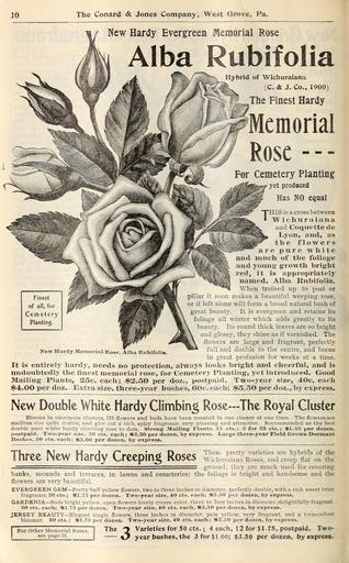 | Keywords: New floral guide (16655853697).jpg 10 <br> The Conard Jones Company West Grove Pa <br> New Hardy Evergreen Memorial Rose <br> Alba Rubifolia <br> Hybrid of Wichuraiana <br> C J Co 1900 <br> The Finest Hardy <br> Memorial <br> Rose --- <br> For Cemetery Planting <br> yet produced <br> Has NO equal <br> HIS is a cross between <br> yv i o li u r a i a n a <br> and Coquette de <br> Lyon and as <br> tlie flowers <br> are pure 'white <br> and much of the foliage <br> and 5'oung growth hrlght <br> red it is appropriately <br> named Alha Kuhifolia <br> When trained up to post or <br> pillar it soou makes a beautiful weeping rose <br> or if left alone will form a broad natural bush of <br> great beauty It is evergreen and retains its <br> foliage all winter which adds greatly to its <br> beauty Its round thick leaves are so bright <br> and glossy they shine as if varnished The <br> flowers are large and fragrant perfectly <br> full and double to the centre and borne <br> in great profusion for weeks at a time <br> It is entirely hardy needs no protection always looks bright and cheerful and is <br> undoubtedly the finest memorial rose for Cemetery Planting- yet introduced Good <br> Mailing- Plants 25c each; 2 50 per doz postpaid Two-year size 40c each <br> 4 00 per doz Extra size three-year bushes 60c each; 5 50 per doz by express <br> New Double White Hardy Climbing Rose ”The Royal Cluster <br> Blooms iu enormous clusters 119 flowers and buds have been counted in one cluster at one time The flowers are <br> medium size quite double and give out a rich spicy fragrance verj- pleasing and attractive Recommended as the best <br> double pure white hardy climbing rose to date Strong Mailing'Plants 15 cts ; 2 for 25 cts ; SI 25 per dozen <br> postpaid Two-year size 30 cts each; S2 50 per dozen by express Large three-year Field GroAvn Dormant <br> Bnsh«'S 50 cts each; 5 00 per dozen by express <br> Finest <br> of all for <br> Cemetery <br> Planting <br> New Hardy Memorial Rose Alba Rubifolia <br> Three New Hardy Creeping Roses <br> These pretty varieties are hybrids of the <br> Wichuraiana Roses and creep flat on the <br> - ground ; the ' are much used for covering <br> banks mounds and terraces in lawns and cemeteries; the foliage is bright and handsome and the <br> flowers are very beautiful <br> EVERGREEN GEM ” Pretty buff j'ellow flowers two to three inches m diameter perfectl - doiible with a rich sweet briar <br> fragrance 30 cts ; SI 75 per dozen Two-year size 40 cts each; S3 50 per dozen by express <br> GARDENIA ” Buds bright -ellow open flowers loveh' cream color three to four inches in diameter delightful - fragrant <br> 20 cts each; S1 75 per dozen Two-year size 40 cts each S3 50 per dozen by express <br> JERSEY BEAUTY ” Elegant single flowers three inches in diameter pale yellow very fragrant and a tremendous <br> bloomer 20 cts ; 1 75 per dozen Two-year size 40 cts each ; SB 50 per dozen by express <br> The 2 Varieties for 50 cts ; 4 each 12 for 1 75 postpaid <br> For Other Memorial Roses <br> see page 31 <br> year bushes the 3for <br> 00; <br> Two- <br> 3 50 per dozen by express 42484172 134532 67120 Page 10 Text http //www biodiversitylibrary org/page/42484172 1901 10 1111/j 1469-7998 1865 tb02381 x Conard Jones Co West Grove Pa ; Henry G Gilbert Nursery and Seed Trade Catalog Collection NameFound Gardenia NameConfirmed Gardenia Ellis EOLID 29805 NameFound Rubifolia Biodiversity Heritage Library New floral guide 1901 Garden Stories Bulbs Plants Catalogs Nursery stock Plants Ornamental Roses Seeds U S Department of Agriculture National Agricultural Library bhl page 42484172 dc identifier http //biodiversitylibrary org/page/42484172 Conard Jones Co Flowers West Grove PA Conard Jones Co bhlGardenStories BHLinbloom bulbs plants plants ornamental u s department of agriculture national agricultural library west grove pa conard jones co bhlgardenstories bhlinbloom Information field Flickr posted date ISOdate 2015-03-19 Check categories 2015 August 23 CC-BY-2 0 BioDivLibrary https //flickr com/photos/61021753 N02/16655853697 2015-08-23 23 50 46 cc-by-2 0 PD-old-70-1923 New floral guide 1901 Photos uploaded from Flickr by Fæ using a script |