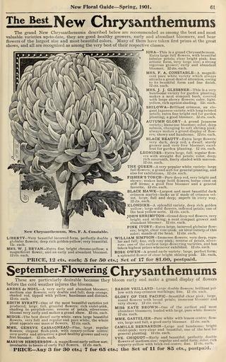 | Keywords: New floral guide (16655926937).jpg New Floral Guide Spring 1901 <br> 61 <br> The Best M w Chrysanthemums <br> The grand New Chrysanthemums described below are recommended as among the best and most <br> valuable varieties up-to-date they are good healthy growers early and abundant bloomers and bear <br> flowers of the largest size and most beautiful colors Many of them have taken first prizes at the great <br> shows and all are recognized as among the very best of their respective classes <br> lORA This is a grand Chrysanthemum <br> Extra large full flowers with beautiful <br> tubular petals; clear bright pink; fine <br> artistic form very large size; a strong <br> vigorous grower; early and abundant <br> bloomer 12 cts each <br> MRS F A CONSTABLE-A magnifi- <br> cent pure white variety which always <br> attracts a great deal of attention owing <br> to its beautiful form ud fine finish <br> 12 cts each <br> MRS J J GLESSNER This is a very <br> handsome variety for garden planting; <br> makes a neat compact bush covered <br> with large showy flowers; color light- <br> yellow rich apricot shading 12c each <br> SHILOWA Brilliant crimson an ele- <br> gant Japanese variety with long tv/isted <br> petals; extra fine bright red for garden <br> planting; a good bloomer 12 cts each <br> AUTUMN GLORY A grand Japanese <br> variety; immense bloomer; color deep <br> salmon changing to soft shrimp pink; <br> always makes a grand display of flow- <br> ers; showy and handsome 12 cts each <br> BLACK BEAUTY Extra large flowers; <br> very dark deep red; a dwarf sturdy <br> grower and very free bloomer; excel- <br> lent for garden planting 12 cts each <br> LEONIDES Extra large full regular flow- <br> ers with straight flat petals; color deep <br> rich amaranth finely shaded with maroon <br> 12 cts each <br> THE QUEEN Avery popular white variety; large <br> full flowers; a grand sort for general planting and <br> also for exhibitions 12 cts each <br> FISHER'S TORCH Pure deep red very bright and <br> showy; makes large bold flowers borne erect on <br> stiff stems; a good free bloomer and a general <br> favorite 12 cts each <br> BLACK HAWK Largest and most beautiful dark <br> crimson scarlet looks as if made of crimson vel- <br> vet large full and deep; superb in every way <br> 12 cts each <br> KLONDIKE A splendid variety deep rich golden <br> yellow; large solid flowers reflexed petals; one of <br> the best yellow sorts 12 cts each <br> JOHN SHRIMPTON Grand deep red flowers very <br> bright and striking; a neat compact grower and <br> abundant bloomer 12 cts each <br> PINK IVORY Extra large incurved globular flow- <br> ers; bright clear rose-pink; an ideal variety of this <br> color; stands at the head 12 cts each <br> WILLIAM SIMPSON Immense flowers; very deep regu- <br> lar and full; fine rich rosy pink; reverse of petals silver- <br> rose; one of the earliest large-flowering varieties and has <br> taken highest prizes whenever exhibited 12 cts each <br> ROSE OWEN A grand early variety; large perfect form; <br> a splendid flower of clear bright shining pink 12c each <br> PRICE 12 cts each; 5 for 50 cts ; Set of 17 for 1 60 postpaid <br> S eptember-Flowering' Chrysanthemums <br> These are partictilarly desirable because they bloom early and make a grand display of flowers <br> before the cold weather injures the blooms <br> New Clirysanthemum Mrs F A Constable <br> LIBERTY Very beautiful incurved form perfectly double <br> globular flowers; deep rich golden-yellow; very beautiful <br> 12c each <br> MRS W J BRYAN Extra fine bright chrome-yellow; a <br> magnificent flower and an early and abundant bloomer <br> 12 cts each <br> BARON VEILLARD Ivarge double flowers; brilliant yel- <br> low with rosy-crimson markings; fine 12 cts each <br> GLORY OF THE PACIFIC Beautiful clear pink; large <br> round flowers wnth broad petals; immense bloomer and <br> very showy 12 cts each <br> MISS KATE BROWN One of the earliest and most <br> abundant bloomers; loaded with large pure white flowers <br> 12 cts each <br> MME GASTELIER Pure white with lemon centre; flow- <br> ers large and full a good early bloomer 12 cts each <br> CAMILLE BERNARDIN Large and handsome; bright <br> violet-pink; very clear and beautiful; one of the best for <br> general planting 12 cts each <br> WE CHIQUOT Early and beautiful; perfectly double <br> flowers of medium size; regular and solid form; color rich <br> coppery-yellow with brick-red centre; fine 12 cts each <br> PKICE Any 3 for 30 cts ; 7 for 65 cts ; tlie Set of 11 for S5 cts postpaid <br> ARBRE de NOEL A very early and abundant bloomer; <br> medium size flowers; very double and full; deep orange <br> shaded red tipped with yellow; handsome and distinct <br> 12 cts each <br> EDITH SYRATT One of the most beautiful varieties yet <br> produced; large full graceful flowers; rich violet-pink <br> shading to purplish-rose; reverse of petals silver-rose; <br> blooms very early and makes a grand show 12 cts each <br> MIDGE The best dwarf early white extra large beautiful <br> flowers very full and regular and pure white; the whole <br> plant appears one mass of flowers 12 cts each <br> MME GENEVE CASSAGNEAU Fine largfe regular <br> flowers; elegant flesh-pink with canary-yellow centre; <br> very pretty and attractive; a good healthy grower and very <br> free bloomer 12 cts each <br> MARION HENDERSON A magnificent early yellow sort; <br> invaluable to lovers of early Fall flowers 12 cts each 42484223 134532 67120 Page 61 Text http //www biodiversitylibrary org/page/42484223 1901 10 1111/j 1469-7998 1865 tb02381 x Conard Jones Co West Grove Pa ; Henry G Gilbert Nursery and Seed Trade Catalog Collection NameFound Chrysanthemum NameConfirmed Chrysanthemum EOLID 38388 NameBankID 2657422 NameFound Leonides NameConfirmed Leonides EOLID 8907570 NameBankID 4216925 Biodiversity Heritage Library New floral guide 1901 Garden Stories Bulbs Plants Catalogs Nursery stock Plants Ornamental Roses Seeds U 