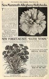 | Keywords: New floral guide (16677122219).jpg 96 <br> The Conard Jones Company West Grove Pa <br> New Mammoth Allegheny Hollyhocks <br> THESE Grand New Allegheny <br> Hollyhocks are exceedingly <br> beautiful and entirely differ- <br> ent from the old kinds They were <br> extensively planted last year and <br> gave immense satisfaction They <br> grow five to six feet high begin to <br> bloom ver quickly and are covered <br> almost their whole length with <br> large double cliry santlieuiimi- <br> like flowers from four to five <br> iucbes across and of such ex- <br> quisite colors and texture they look <br> as if made of criislied silk and <br> produce a beautiful rainbow <br> effect Splendid for Beds <br> Borders Porch Fronts etc <br> wherever a partial screen of beauti- <br> ful flowers is desired <br> Finest Colors Mixed <br> Pkt 40 seeds 6 cts <br> Also MAKOOX ROSE and <br> SUEL LPINKseparato eacU <br> 8 cts per Packet The 3 <br> Packets for 20 cts <br> New Mammotli Allegheny Hollyhock <br> 5 <br> NEW FORGET-ME-NOT WATER NYMPH <br> This is the largest flowering variety of the True Forg-et-Me-Xot Myosotis and the very best <br> for cut flowers The individual blossoms are very large the color is lovely sky-blue with a clear yellow <br> eye and they are borne in large clusters <br> on stems 12 to 15 inches long The plants <br> like a moist shady situation where they <br> will bloom constantly Pkt 6 ctS <br> New Japanese Dianthus <br> New Large- Flowering Japanese Dianthus <br> ORIENTAL BEAUTIES <br> A magnificent new strain of large flow- <br> ering Dianthus highly recommended as <br> a novelty of sterling merit The flowers <br> are 3 to 4 inches across exquisitely <br> formed with full overlapping petals <br> elegantly crinkled and ruffled; the colors <br> range from pure white to pink and crim- <br> son Plants are perfectly hardy and true <br> perpetual bloomers; old flowers can be cut <br> off to bring on new crop Pkt 6 cts <br> » Grand New White-Fringed Poppy <br> MAID OF THE MIST <br> A new and exquisitely beautiful poeny- <br> flowered poppy; enormous flowers pure <br> snow white and 7 to 10 inches across <br> elegantly fringed and borne on slender <br> nodding stems One of the most beauti- <br> ful of all poppies Pkt 8 cts <br> The Four Fine Novelties above one Packet each only 20 cts postpaid 42484258 134532 67120 Page 96 Text http //www biodiversitylibrary org/page/42484258 1901 10 1111/j 1469-7998 1865 tb02381 x Conard Jones Co West Grove Pa ; Henry G Gilbert Nursery and Seed Trade Catalog Collection NameFound Dianthus NameConfirmed Dianthus EOLID 11254753 NameBankID 2646562 NameFound MYOSOTIS NameConfirmed Myosotis EOLID 40769 NameBankID 2654540 Biodiversity Heritage Library New floral guide 1901 Garden Stories Bulbs Plants Catalogs Nursery stock Plants Ornamental Roses Seeds U S Department of Agriculture National Agricultural Library bhl page 42484258 dc identifier http //biodiversitylibrary org/page/42484258 Conard Jones Co Flowers West Grove PA Conard Jones Co bhlGardenStories BHLinbloom bulbs plants plants ornamental u s department of agriculture national agricultural library west grove pa conard jones co bhlgardenstories bhlinbloom Information field Flickr posted date ISOdate 2015-03-19 Check categories 2015 August 23 CC-BY-2 0 BioDivLibrary https //flickr com/photos/61021753 N02/16677122219 2015-08-23 23 53 33 cc-by-2 0 PD-old-70-1923 New floral guide 1901 Photos uploaded from Flickr by Fæ using a script |