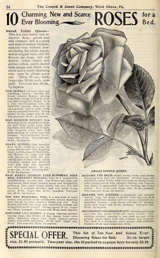 | Keywords: New floral guide (16837301406).jpg 24 <br> The Conard Jones Company West Grove Pa <br> i \ Charming New and Scarce <br> \\J Ever Blooming <br> Sweet Little Queen <br> This is a very dainty and at- <br> tractive Rose grows neat <br> and compact and is a quick <br> and most abundant bloomer <br> scarcely ever without flow- <br> ers during the whole season <br> makes elegant buds and the <br> flowers are large full and <br> double Color bright rich <br> golden yellow centre shaded <br> with orange and blush very <br> sweet and a really charming <br> rose sure to please every <br> one Price 20 cts each; <br> larger size 25 cts each post- <br> paid Two-year size 40 cts <br> by express <br> THE JEWELL A most novel and <br> charming variety bearing dif- <br> ferent colored flowers varN'ing <br> from deep orange yellow to crim- <br> son and variegated shades It is <br> a true ever-blooming rose de- <br> lightfully scented does well in <br> open ground and is quite hardy <br> and an abundant bloomer Strong <br> plants 15 cts ; larger size 20 cts <br> Two-j'ear size 35 cts by express <br> MAD EUGENIE BOULET-New <br> European Rose; magnificent flow- <br> ers and buds; extra large fine <br> cup form well filled and delight- <br> fully fragrant; color; fine buff <br> pink shading to yellow and rich <br> carmine Verv handsome 10 cts ; <br> larger size 15 cts Two-year size <br> 30 cts by express <br> PEARL RIVERS-This beautiful <br> Rose is the result of a cross be- <br> tween Devoniensis the Magnolia <br> Rose and Madame de Watteville <br> The flowers are large and full <br> with peachy-red buds; the pre- <br> vailing color is ivorj' white petals <br> delicately shaded and bordered <br> with pale rose; very beautiful <br> and deliciously sweet 10 cts ; <br> larger size 15 cts Two-year size <br> 30 cts by express <br> NEW HARDY CRIMSON EVER BLOOMING ROSE <br> MRS PIERPONT MORGAN This is a wonderfully <br> beautiful Rose - in every way The flowers are large and <br> very double with broad massive petals and delightfully <br> perfumed color pure bright cherry red very rich and <br> beautiful; a constant bloomer ; and very hardy strong <br> plants 20 cts ; larger size 25 cts ; postpaid Two-year <br> size 40 cts by express <br> THE RED MARECHAL NIEL is a new Rose of great <br> beauty very similar to the well-known Yellow Marechal <br> Niel except in color which is bright rosy red Both <br> flowers and buds are large and beautifully formed and <br> delightfully sweet scented Strong plants 15 cts ; larger <br> size 20 cts postpaid Two-year size 35 cts each express <br> COMTESSE LILY KINSKY A strong vigorous grower <br> bearing large full flowers of fine regular form; color <br> white delicately tinged with blush chamois yellow <br> centre ; very sweet and pretty 15 cts each ; larger size <br> 20 cts Two-year size 35 cts by express <br> <br> ROSES <br> for a <br> Bed <br> SWEET lilTTLE QUEET <br> MADAME VON BOCH Plant strong bushy and always <br> blooming from June till November Flowers large and <br> well filled opens freely; buds very large on strong stems <br> color creamy-yellow with carmine shading very fragrant <br> and highly recommended both for bedding and house <br> culture Price 15 cts each; larger size 20 cts postpaid <br> Two-year size 35 cts by express <br> MADAME VON SIEMENS-A handsome and valuable <br> variety; large full Roses of perfect form fine rosy flesh <br> colored beautifully shaded and very sweet a constant and <br> abundant bloomer ; quite hardy and fine for bedding <br> 15 cts each; larger size 20 cts postpaid Two-year size <br> 35 cts by express <br> REICHSGRAF VON KESSELSTATT Flowers extra large <br> and quite full petals broad and nicely arched ; color <br> brilliant carmine passing to rose pink on pure white <br> ground; petals edged with rich crimson ver\' fragrant <br> The bush is a handsome erect grower and abundant <br> bloomer 10 cts each; larger size 15 cts <br> PFTTAT OPPPP Scarce Ever <br> i EljlilJL VyirClx Blooming Roses for Bed 1 15; larger <br> size 1 50 postpaid Two-year size the 10 packed to express here for only 2 75 i 42484186 134532 67120 Page 24 Text http //www biodiversitylibrary org/page/42484186 1901 10 1111/j 1469-7998 1865 tb02381 x Conard Jones Co West Grove Pa ; Henry G Gilbert Nursery and Seed Trade Catalog Collection NameFound Magnolia NameConfirmed Magnolia sect Splendentes Dandy ex J A Vazquez G EOLID 44478 Biodiversity Heritage Library New floral guide 1901 Garden Stories Bulbs Plants Catalogs Nursery stock Plants Ornamental Roses Seeds U S Department of Agriculture National Agricultural Library bhl page 42484186 dc identifier http //biodiversitylibrary org/page/42484186 Conard Jones Co Flowers West Grove PA Conard Jones Co bhlGardenStories BHLinbloom bulbs plants plants ornamental u s department of agriculture national agricultural library west grove pa conard jones co bhlgardenstories bhlinbloom Information field Flickr posted date ISOdate 2015-03-19 Check categories 2015 August 23 CC-BY-2 0 BioDivLibrary https //flickr com/photos/61021753 N02/16837301406 2015-08-23 23 54 55 cc-by-2 0 PD-old-70-1923 New floral guide 1901 Photos uploaded from Flickr by FĂŚ using a script |